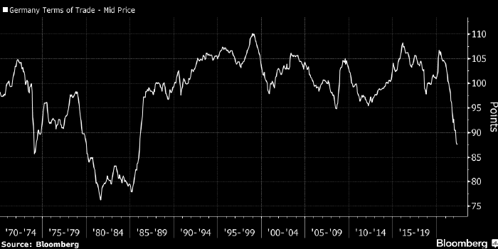 Динамика условий торговли (относительная цена экспорта в пересчете на импорт) Германии. Источник: Bloomberg