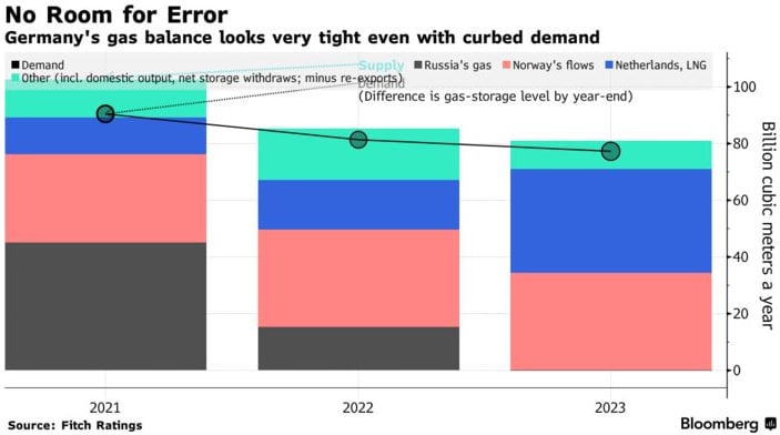 Если 15-процентное сокращение будет достигнуто, и погодные условия будут благоприятными, есть шанс, что континент справится с этим отопительным сезоном, даже при полном отключении российского газа, согласно Fitch Ratings. Но баланс между спросом и предложением является сложной задачей для экономической державы Германии, поскольку ее запасы газа, как ожидается, сократятся, а это означает, что у нее почти не будет буфера от неожиданностей, включая аномальные холода. «Права на ошибку не будет», — сказала Анджелина Валавина, глава отдела природных ресурсов и сырьевых товаров EMEA в Fitch.