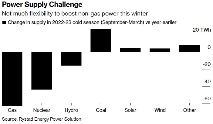 В то время как промышленность сократила потребление газа, спрос на топливо для производства электроэнергии оказался выше, чем ожидалось. Этим летом аномальная жара и засухи нанесли ущерб гидромощностям, в то время как потепление речных вод и французские аварии на атомной электростанции сократили выработку атомной энергии. Баланс генерации в Европе «серьезно затруднен», поскольку «недостаточно гибкости для значительного наращивания мощности из других источников», отмечают аналитики Rystad Energy в заметке. По их словам, очень холодная погода и слабый ветер могут привести к нормированию и отключению электроэнергии.
