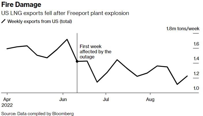 Урон от пожара. Экспорт СПГ из США упал после взрыва на заводе в Фрипорте. Источник: данные, собранные Bloomberg.
