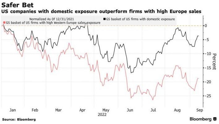 Goldman отдает предпочтение вложениям в США в перспективе до конца года, который оказался особенно трудным для бизнеса в Европе на фоне газового кризиса, стремительного роста инфляции и ужесточения политики центрального банка. В долларовом выражении Stoxx Europe 600 отстает от S&P 500 в этом году, а корзина Goldman, состоящая из американских компаний со 100% продажами на внутреннем рынке, превзошла корзину компаний с высокими продажами в Европе.
