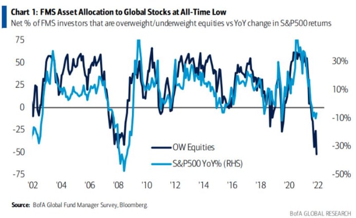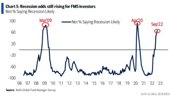 По мере роста опасений по поводу экономики число инвесторов, ожидающих рецессии, достигло самого высокого уровня с мая 2020 года, написали в записке во вторник стратеги во главе с Майклом Хартнеттом. По их словам, настроения «супермедвежьи», поскольку энергетический кризис еще больше усугубляет отвращение к риску. Чистые 42% глобальных инвесторов имеют недостаточный вес в европейских акциях, что является крупнейшей такой позицией за всю историю.