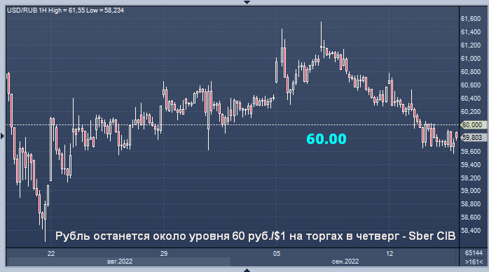 Курс рубля останется около равновесного уровня в 60 руб./$1 на торгах в четверг в отсутствие крупных валютных потоков, полагают эксперты Sber CIB.
