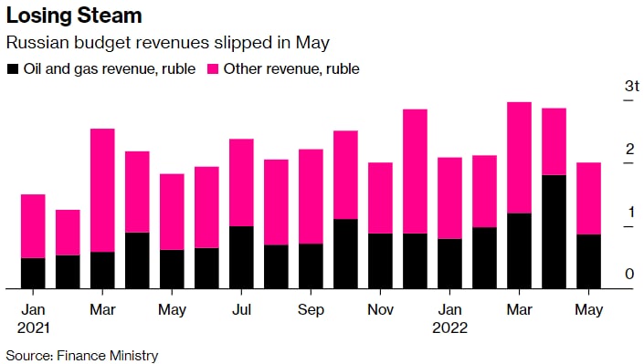 Расчеты Bloomberg, основанные на данных, предоставленных министерством, показали, что доходы от нефти и газа упали в прошлом месяце до 871 млрд рублей (14,9 млрд долларов) с 1,81 трлн рублей в апреле, что стало самым высоким показателем как минимум за десятилетие. По подсчетам Bloomberg, доходы от прочих налогов и акцизов выросли на 7,5% по сравнению с предыдущим месяцем до 1,14 трлн рублей.