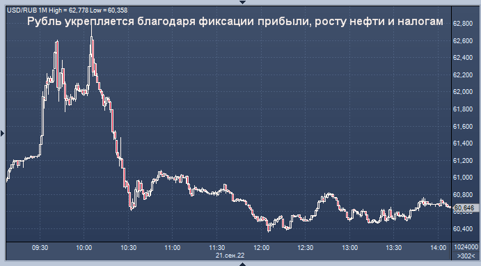 Рубль мало изменился к доллару и укрепился по отношению к евро и юаню после вступления в силу Указа президента Владимира Путина о частичной мобилизации 300 000 резервистов, что стало серьезной эскалацией военного конфликта на Украине. Рубль -0,27% до 60,73; к евро рубль прибавил +0,5% до 60,31.
