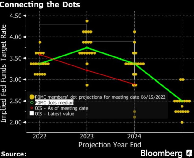 Подразумеваемые рынком ожидания в отношении так называемого точечного графика в этом месяце подскочили, и некоторые игроки делают ставки на то, что пик составит около 5%, если не выше. Рынки в целом оценивают пик на уровне 4,5% к марту и ставку на конец 2023 года от 4% до 4,25%. Напротив, самые последние прогнозы чиновников ФРС в июне почти все ниже 4% на 2022-2024 годы.