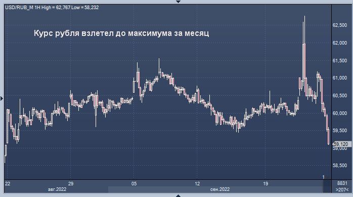 Российская валюта впервые за три дня укрепилась по отношению к доллару США даже несмотря на новости о военной кампании в Украине и ужесточение ДКП Федеральной резервной системы, снижающее глобальный аппетит к риску. Рубль вырос на 2,54% по отношению к доллару в Москве до 59,13 и готов закрыться на самом высоком уровне с 22 августа.