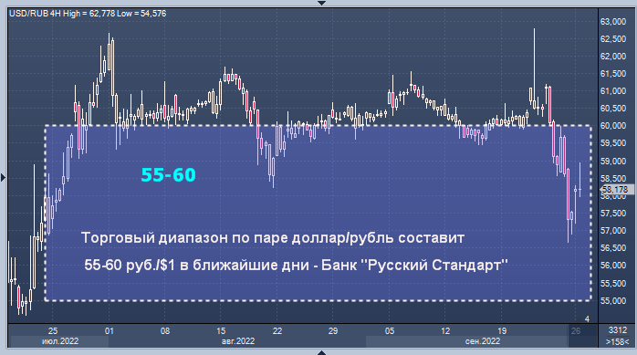 Торговый диапазон по паре доллар/рубль, скорее всего, составит в ближайшие дни 55-60 руб./$1, по паре евро/рубль - также 55-60 руб./EUR1, считает директор департамента операций на финансовых рынках банка "Русский Стандарт" Максима Тимошенко.