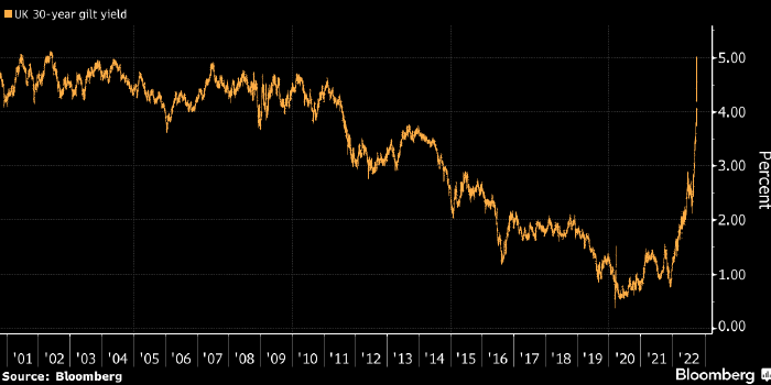 Распродажа британских гособлигаций продолжается: сегодня доходность 10-летних бумаг взлетела до рекордного значения с ноября 2008 года в области 4,54%, а доходность 30-леток превысила 5% впервые за два десятилетия.