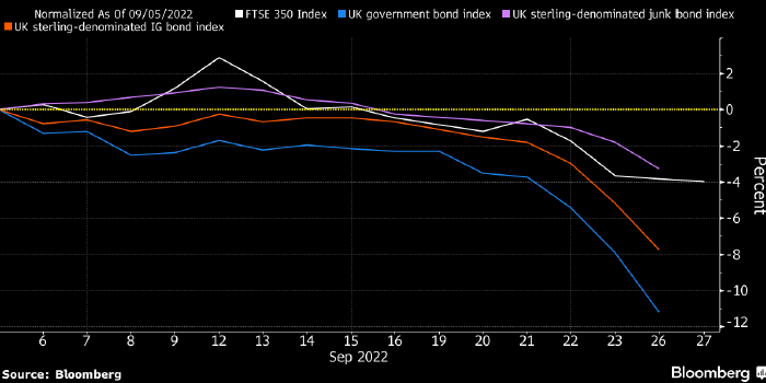Процентная динамика различных британских активов с момента прихода Лиз Трасс на пост премьер-министра Великобритании. Источник: Bloomberg