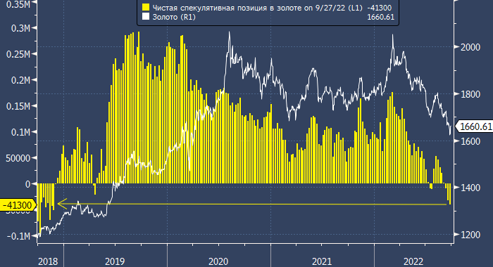 На неделе до 27 сентября чистая позиция крупных спекулянтов (вроде хедж-фондов) во фьючерсах и опционах на золото достигла нового максимального объема с конца 2018 года (см. график выше). Об этом в пятницу, 30 сентября, сообщила американская Комиссия по торговле товарными фьючерсами (CFTC).