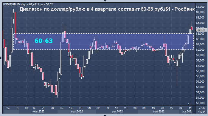 Диапазон колебаний курса доллара к рублю в 4 квартале 2022 года может составить 60-63 руб./$1, прогнозируют экономисты Росбанка.
