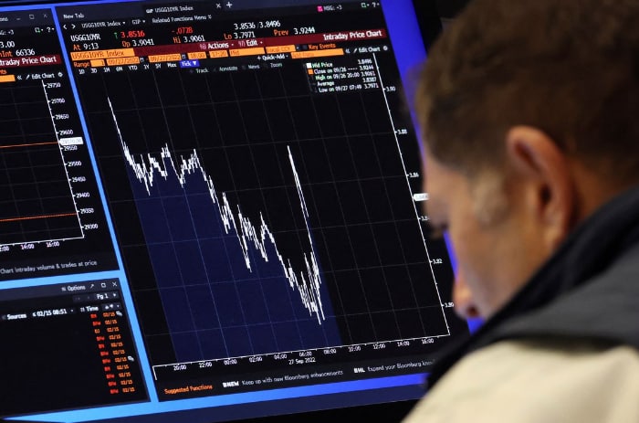 Трейдер работает в зале Нью-Йоркской фондовой биржи (NYSE) в Нью-Йорке, США, 27 сентября 2022 г. REUTERS/Брендан Макдермид