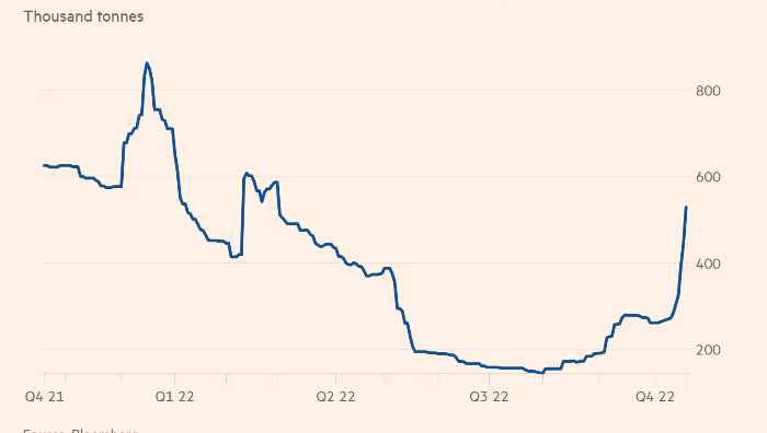 Если биржа продолжит принимать российское сырье на склады, но при этом многие пользователи будут избегать его, это приведет к накоплению запасов.