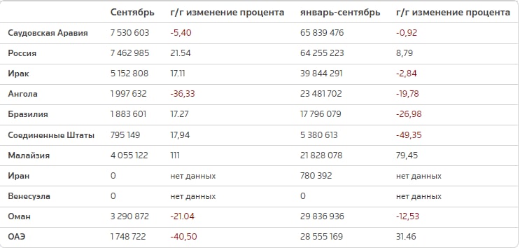 За первые девять месяцев первое место занимала Саудовская Аравия с объемом 65,84 млн тонн, что на 1% меньше, чем за год. Российские объемы выросли почти на 9% до 64,26 млн тонн, заняв второе место.