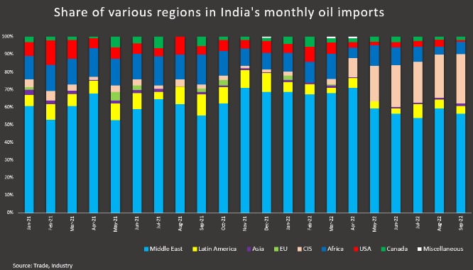Данные показали, что импорт Индии с Ближнего Востока упал примерно до 2,2 млн баррелей в сутки, что на 16,2% меньше, чем в августе, в то время как импорт из России увеличился на 4,6% до примерно 896 000 баррелей в сутки после падения в предыдущие два месяца.