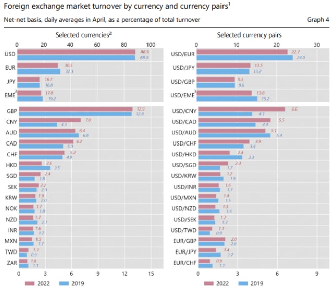 Непоколебимое доминирование доллара США означало, что он участвовал в 88% всех сделок — уровень, который он поддерживал в течение последнего десятилетия, в то время как евро оставался второй наиболее активно торгуемой валютой, несмотря на небольшое снижение его доли до 31%.