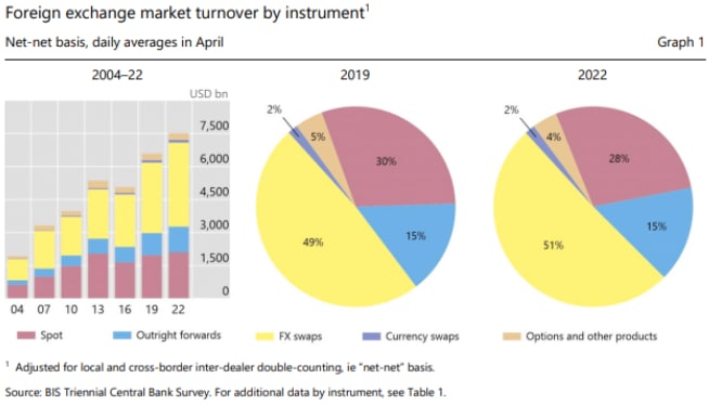 Оборот валютных свопов составил 51% мирового оборота по сравнению с 49% в 2019 году, тогда как спотовые сделки упали с 30% до 28%, а доля прямых форвардов осталась на уровне 15%.