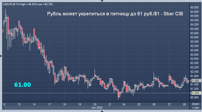 Рубль может укрепиться в пятницу до 61 руб./$1, если риторика Банка России окажется довольно жёсткой, а экспортёры в последний день налоговых выплат будут активно продавать валюту, считают эксперты Sber CIB.
