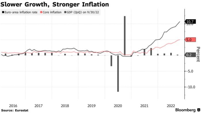 Инфляция в еврозоне подскочила до нового исторического максимума, в то время как экономика блока потеряла импульс, что усилило опасения, что рецессия теперь почти неизбежна.