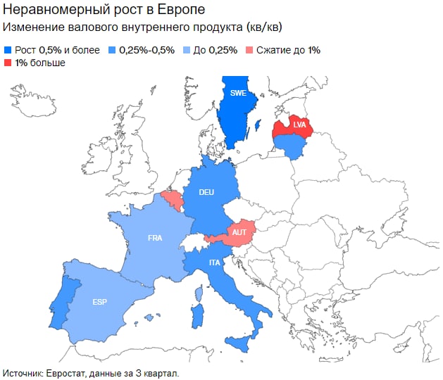 Неравномерный рост в Европе. Изменение валового внутреннего продукта (кв/кв). Источник: Евростат, данные за 3 квартал.