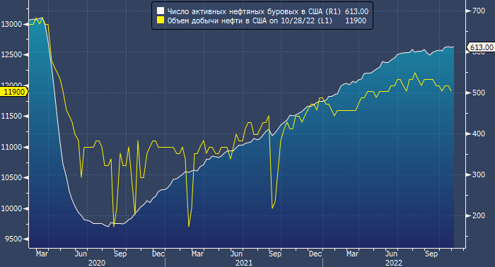 Несмотря на это, по данным Baker Hughes, число активных нефтяных буровых в США на неделе до 4 октября достигло нового циклического максимума на уровне 613 штук, тогда как добыча нефти в стране, по сути, не растет с лета.
