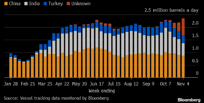 Средний четырехнедельный объем морского экспорта нефти из РФ в млн б/с по странам. Источник: Bloomberg