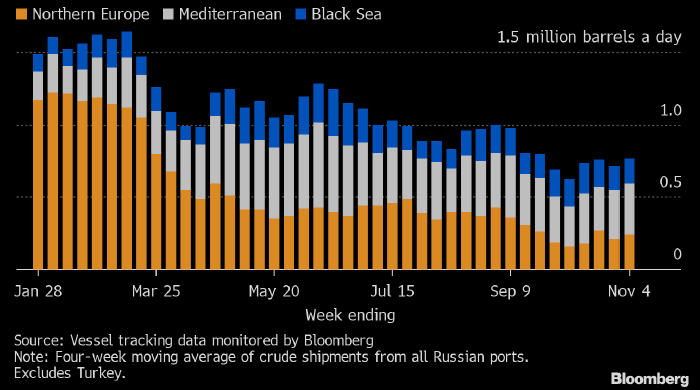 Средний четырехнедельный объем морского экспорта нефти из РФ в Европу в млн б/с по месту назначения. Источник: Bloomberg