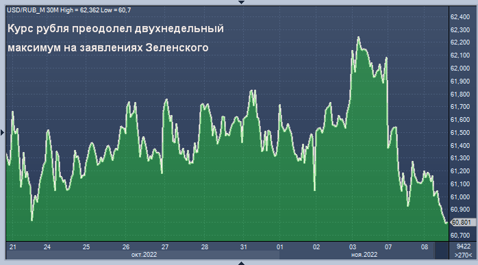 К 11:01 по Гринвичу рубль укрепился по отношению к доллару на 0,2% до 60,87, преодолев самый сильный уровень с 21 октября 60,8275.