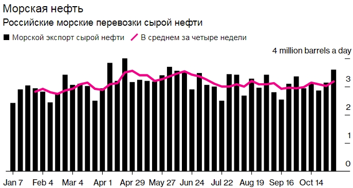 Морская нефть. Российские морские перевозки сырой нефти. Источник: данные отслеживания судов, проверенные Bloomberg.