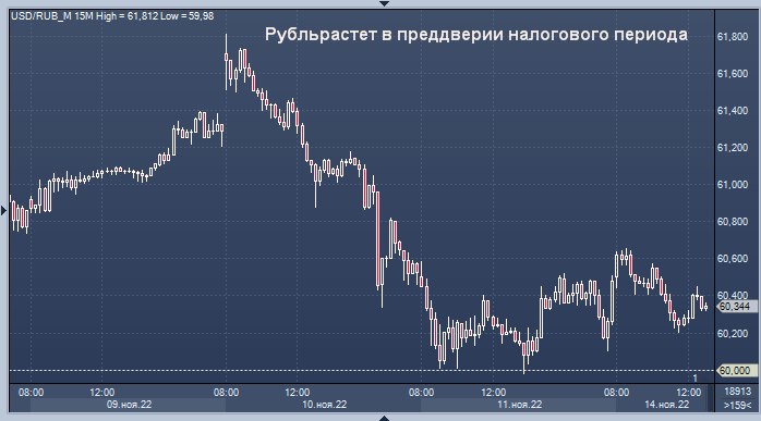 "Курс доллара США к рублю, вероятно, останется в диапазоне 60-62 рублей на этой неделе", - говорится в записке аналитиков Банка "Санкт-Петербург", добавляя, что рубль может завершить неделю ближе к отметке 60, поскольку он выигрывает от нового налогового периода, начинающегося завтра.
