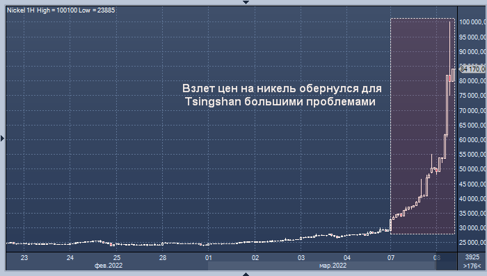 Торги никелем на LME начались с небольшого снижения, но затем за 15 минут котировки взлетели примерно на 18% в область $31 000 за тонну, уперевшись в максимально допустимый «потолок» роста цен. По словам брокеров и трейдеров, на которых ссылается Bloomberg, причиной этого события стало неподтвержденное сообщение китайского СМИ о взрыве на небольшом никелевом заводе в Индонезии.