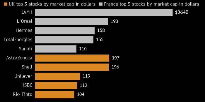 По состоянию на понедельник, 14 ноября, капитализация крупнейшей французской компании LVMH (владелец брендов Christian Dior, Louis Vuitton, Givenchy, Guerlain, Moët & Chandon, Hennessy и др.) лишь немногим недотягивала до совокупной капитализации двух крупнейших британских компаний — AstraZeneca и Shell. А совокупная капитализация пяти крупнейших компаний Франции на уровне $979 млрд заметно превышала совокупную капитализацию пяти крупнейших компаний Великобритании на уровне $729 млрд.
