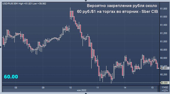 Вероятно закрепление курса рубля по отношению к доллару США около уровня 60 руб./$1 на торгах во вторник, полагают аналитики Сбербанка.