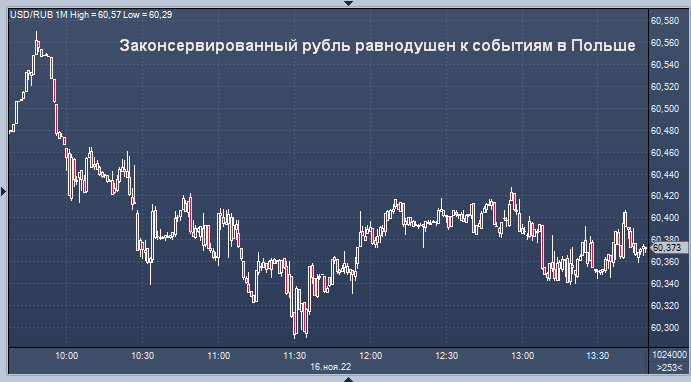 Валюта России мало изменилась по отношению к доллару и евро, и впервые за четыре сессии прибавила по отношению к юаню после того, как лидеры США и Европы призвали к осторожности в связи с инцидентом с падением ракете в Польше недалеко от границы с Украиной. Рубль торгуется на уровне 60,3800 в Москве после роста примерно на 0,3% во вторник.