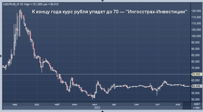 "Основным риском является цена на нефть: мы предполагаем, что она будет падать на фоне рецессии в мире. Торговый баланс перейдет к сокращению: экспорт снизится после стабилизации котировок энергоресурсов и снижения темпов поставок вдвое, а импорт продолжит восстановление. Курс пока могут поддержать сообщения о невозможности найти консенсус странами ЕС о потолке цен на нефть, а также риски остановки торгов валютой после санкций на НКЦ, что снизит отток капитала. Наш прогноз валютного курса USD/RUB предполагает небольшое ослабление рубля в пределах 70 руб./$1 к концу текущего года при цене на нефть $90/барр. с дальнейшим обвалом в 2023г", - прогнозирует эксперт инвесткомпании.