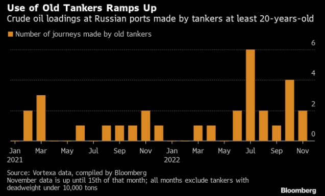 Трейдеры все чаще обращаются к почти устаревшим нефтяным танкерам для перевозки грузов с российской нефтью, поскольку санкции, направленные против доходов страны от продажи нефти, становятся все ближе.