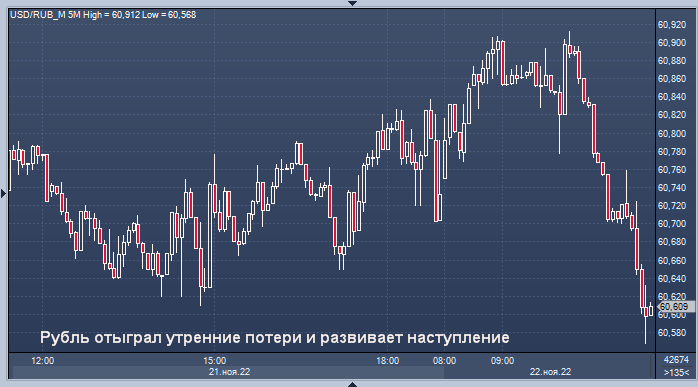 В 11:23 по Москве рубль вырос на 0,21% по отношению к доллару до 60,66, опустившись до 61,1950 ранее в ходе сессии, что является самым слабым показателем с 10 ноября.