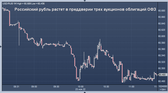 В 11:23 по Москве рубль укрепился на 0,3% по отношению к доллару до 60,46 и потерял 0,1%, торгуясь на уровне 62,37 по отношению к евро. Он укрепился на 0,3% по отношению к юаню до 8,43.