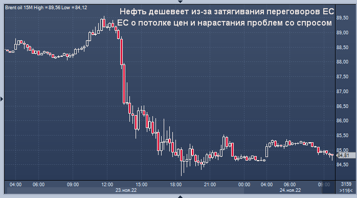 Нефть снова упала, так как Европейский союз стал рассматривать олее высокий, чем ожидалось, предел цен на российскую нефть и усилились признаки проблем со спросом, с рекордными случаями Covid в Китае и рисками рецессии в США.