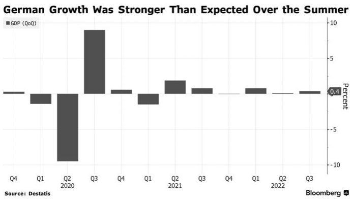 Предстоящие месяцы обещают быть более сложными: ожидается, что крупнейшая экономика Европы переживет рецессию, поскольку компании и домашние хозяйства не выдерживают резкого скачка цен на энергоносители. Однако ее масштабы, по данным Бундесбанка, «чрезвычайно неопределенны», и риск ущерба от нехватки природного газа снизился благодаря необычно теплой осенней погоде и почти заполненным хранилищам природного газа.