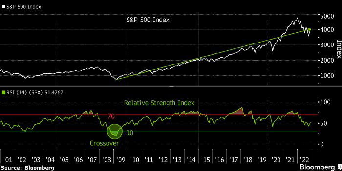 Месячный график индекса S&P 500 (вверху) и индикатора RSI (внизу). Источник: Bloomberg