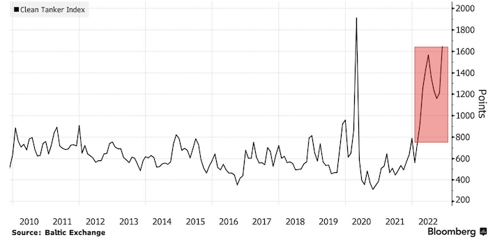 Перевозка нефтепродуктов на Запад на большие расстояния резко увеличивает транспортные расходы и приводит к росту доходов операторов танкеров. По данным Vortexa Ltd., объем топлива, транспортируемого по морю, на 3% выше средних показателей за последние пять лет. Серена Хуанг, ведущий аналитик Vortexa по Азии, считает, что это связано с поставками дизельного топлива из Азии и Ближнего Востока в Европу, при этом объемы могут увеличиться, поскольку Европа вводит запрет на поставки из России.