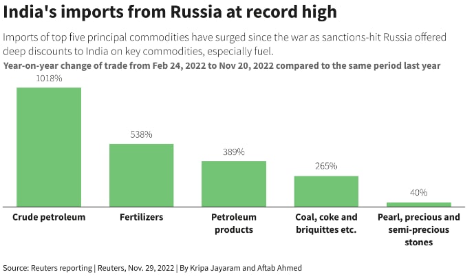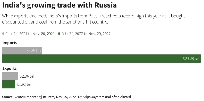 Индийский импорт из России вырос почти в пять раз до 29 миллиардов долларов в период с 24 февраля по 20 ноября по сравнению с 6 миллиардами долларов за аналогичный период год назад. Экспорт, тем временем, сократился до 1,9 миллиарда долларов с 2,4 миллиарда долларов, сообщил источник.
