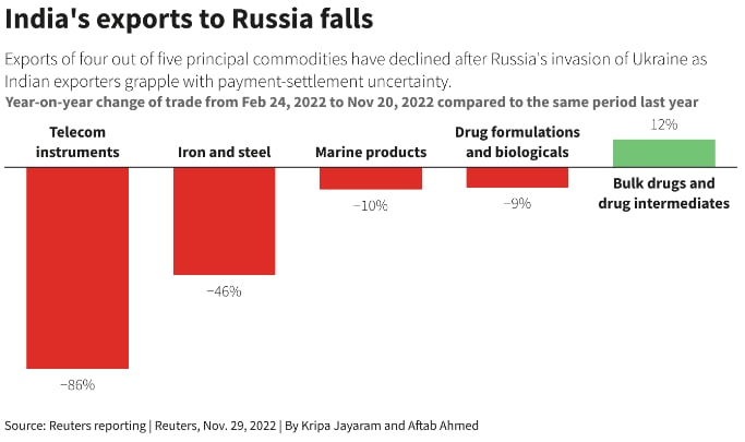 Но некоторые индийские компании неохотно экспортируют в Россию из-за опасений попасть под санкции Запада, отсутствия ясности в отношении платежей и проблем с обеспечением страховки.