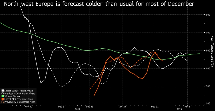 В то время как Европа выиграла от мягкого начала зимнего отопительного сезона, более прохладная погода в декабре окажет большее давление на запасы, созданные за счет рекордных притоков сжиженного природного газа летом.