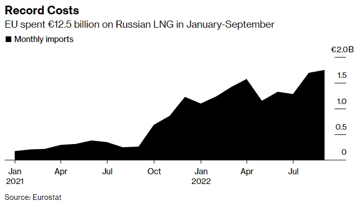 Рекордные расходы. ЕС потратил €12,5 млрд на российский СПГ в январе-сентябре. Источник: Евростат.