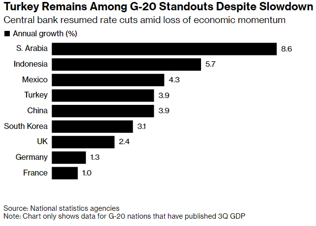 Турция остается среди лидеров G-20, несмотря на замедление. ЦБ возобновил снижение ставок на фоне потери экономического импульса. Источник: Блумберг.