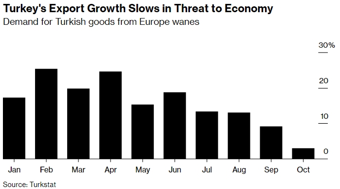 Цель Эрдогана по стимулированию турецкой экономики к буму экспорта также находится под угрозой, поскольку в Европе, ее крупнейшем торговом партнере, нависла угроза рецессии. В разочаровывающем начале четвертого квартала продажи турецких товаров за рубежом выросли всего на 3% в годовом исчислении в октябре по сравнению с более чем 9% в предыдущем месяце.
