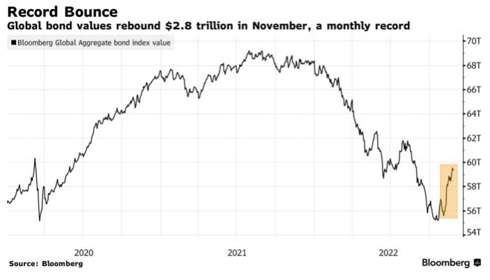 Государственные и корпоративные долговые ценные бумаги инвестиционного уровня выросли до рыночной стоимости в 59,2 трлн долларов с 56,4 трлн долларов в конце октября, что стало самым большим месячным приростом индекса Bloomberg с сентября 1990 года. Рынок восстановился после того, как инфляция в США снизилась больше, чем ожидалось, и Федеральная резервная система указала на возможное замедление агрессивного темпа повышения ставок, поддерживая настроения.